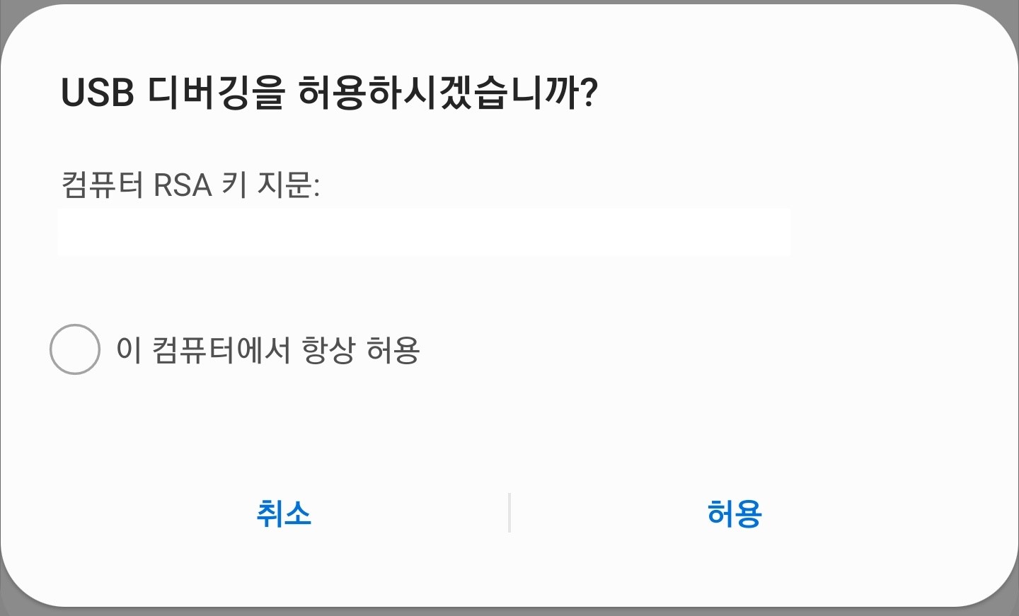 4. 스마트폰을 연결했을 때 뜨는 'USB 디버깅을 허용하시겠습니까?' 팝업에서 허용을 눌러줍니다.