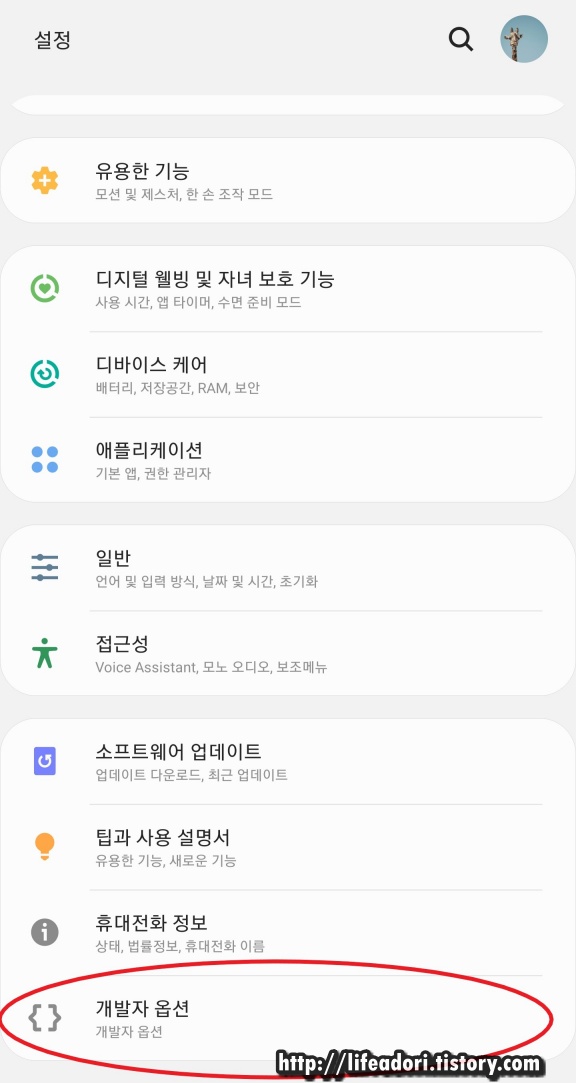 2. 설정 메뉴에서 '개발자 옵션'으로 들어갑니다.