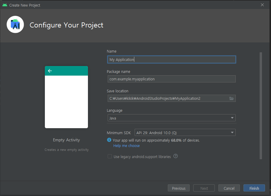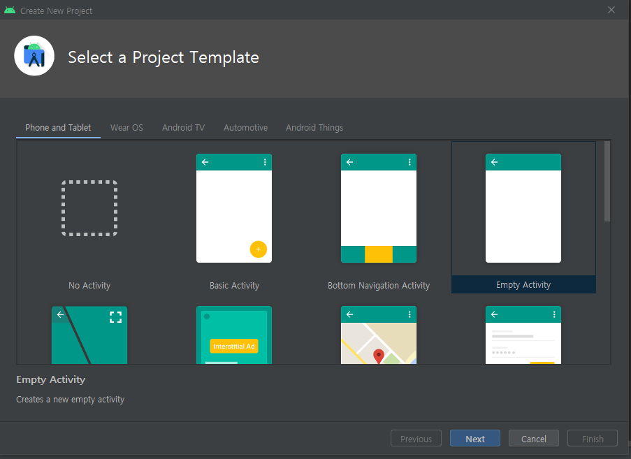 옵션에서 프로젝트 템플릿을 선택합니다(예: Empty Activity, Basic Activity 등).