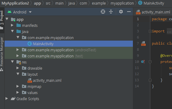 프로젝트가 생성되면 안드로이드 스튜디오의 왼쪽 패널에 프로젝트 구조가 표시됩니다. 다음은 Android 프로젝트의 주요 파일이 어떻게 생겼는지 보여주는 예시입니다: