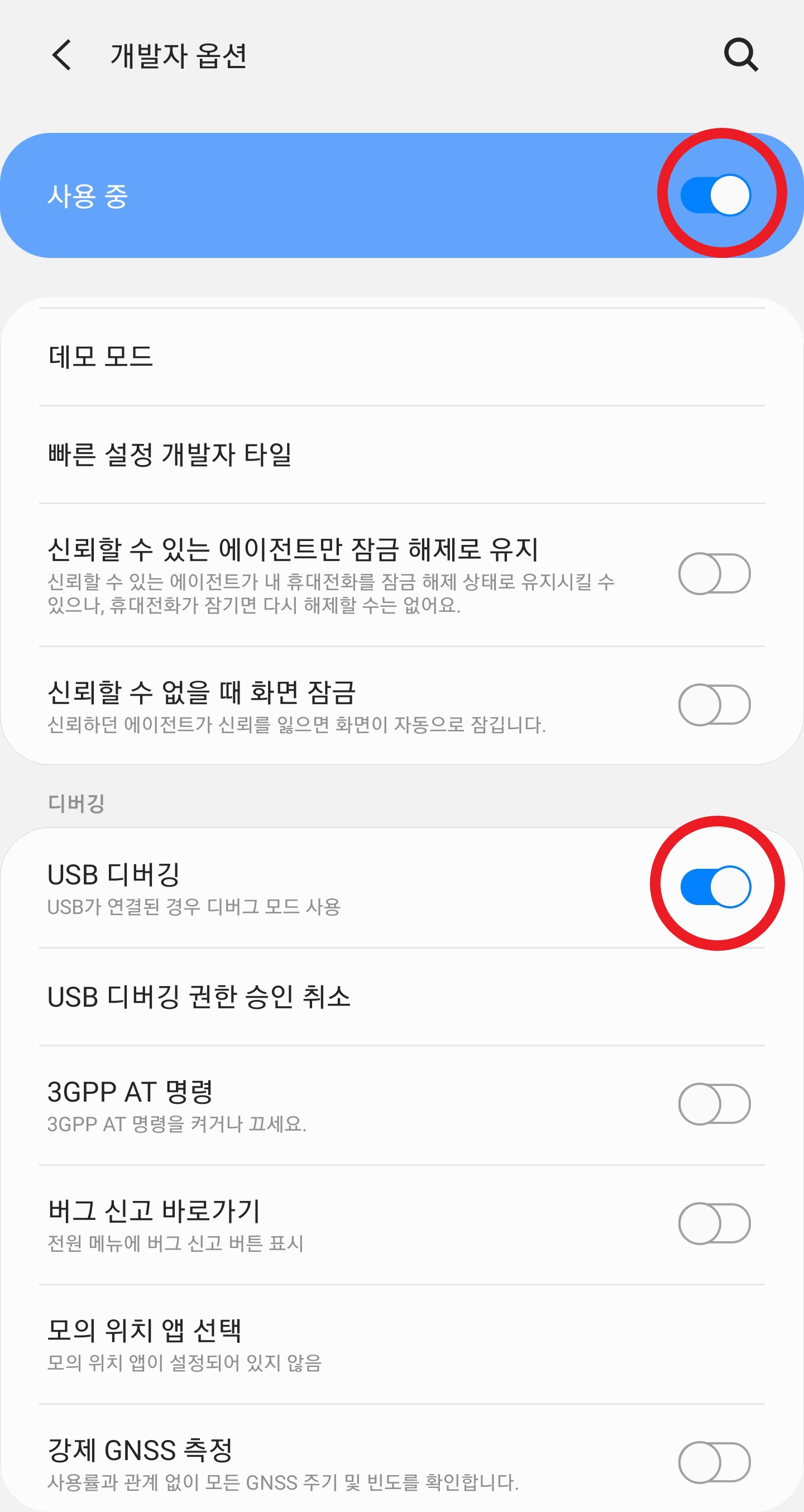 3. '사용 중'이 될 수 있도록 선택하고 'USB 디버깅'을 활성화해줍니다.